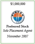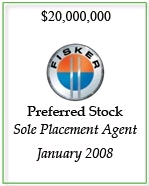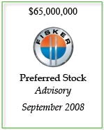 作为美国三大著名电动汽车制造商之一,菲斯克公司(Fisker)的独家财务顾问,海峰资本专业团队的主要成员协助该公司制定战略发展规划,并完成了四次风险融资。该公司被2009年6月出版的福布斯杂志誉为下一个底特律。